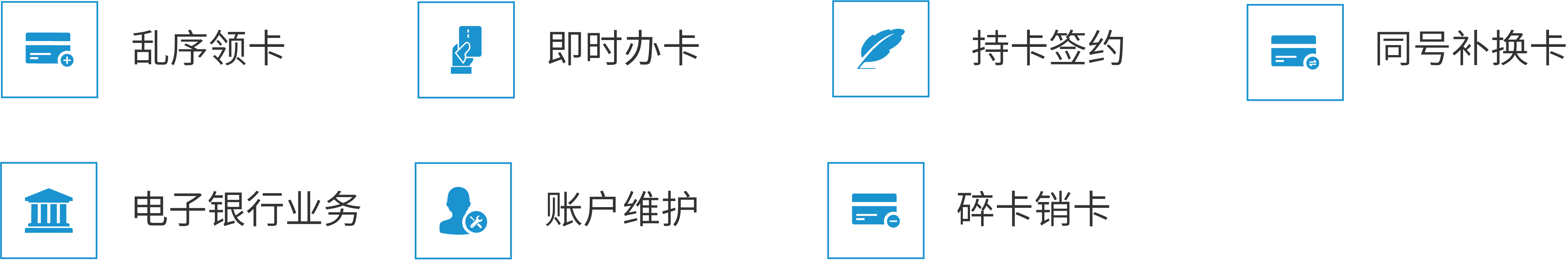销卡过程可视化;支持即时同账号换卡、补卡;自助领取吞没卡、信用卡、理财金卡和金融社保卡等;实时制作个性化定制卡。