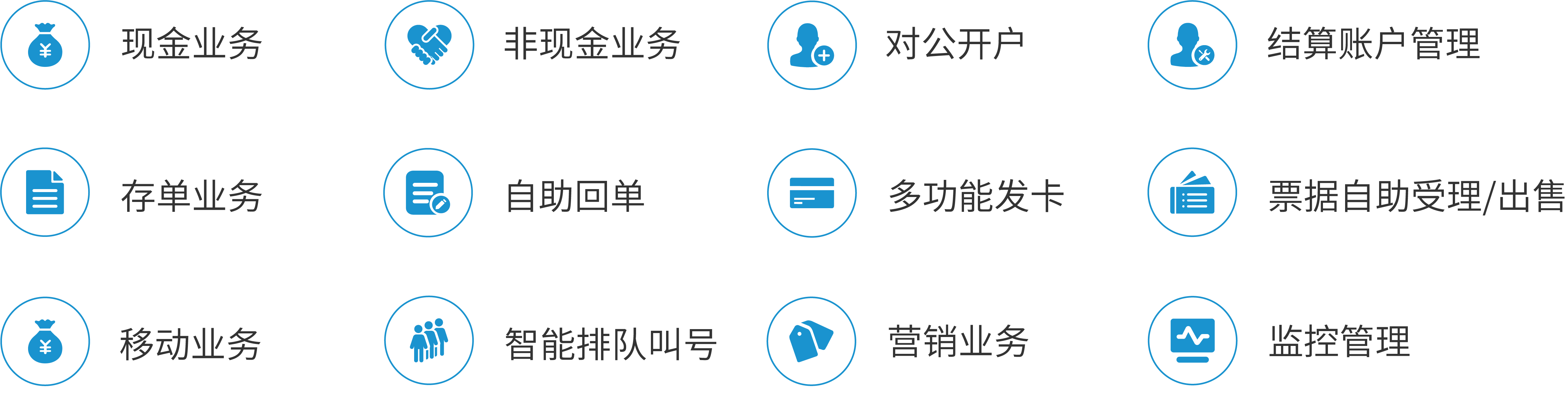 智能柜台软件及跨平台系统涵盖银行网点柜面95%以上业务,具备“开放、智能、敏捷”的特征,充分运用AI、大数据、分布式微服务架构等技术为商业银行的智慧网点转型提供全面的软、硬件解决方案。